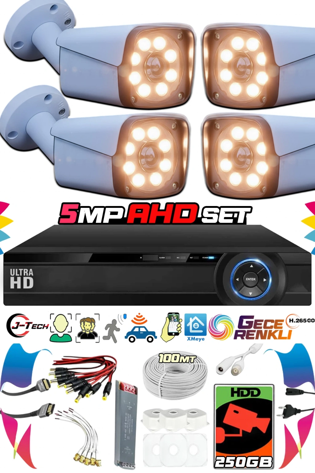 4 Kameralı AHD Set 250GB 3030- 5MP Sony Lensli HD Gece Renkli Güvenlik Kamerası Sistemi -Cepten izle