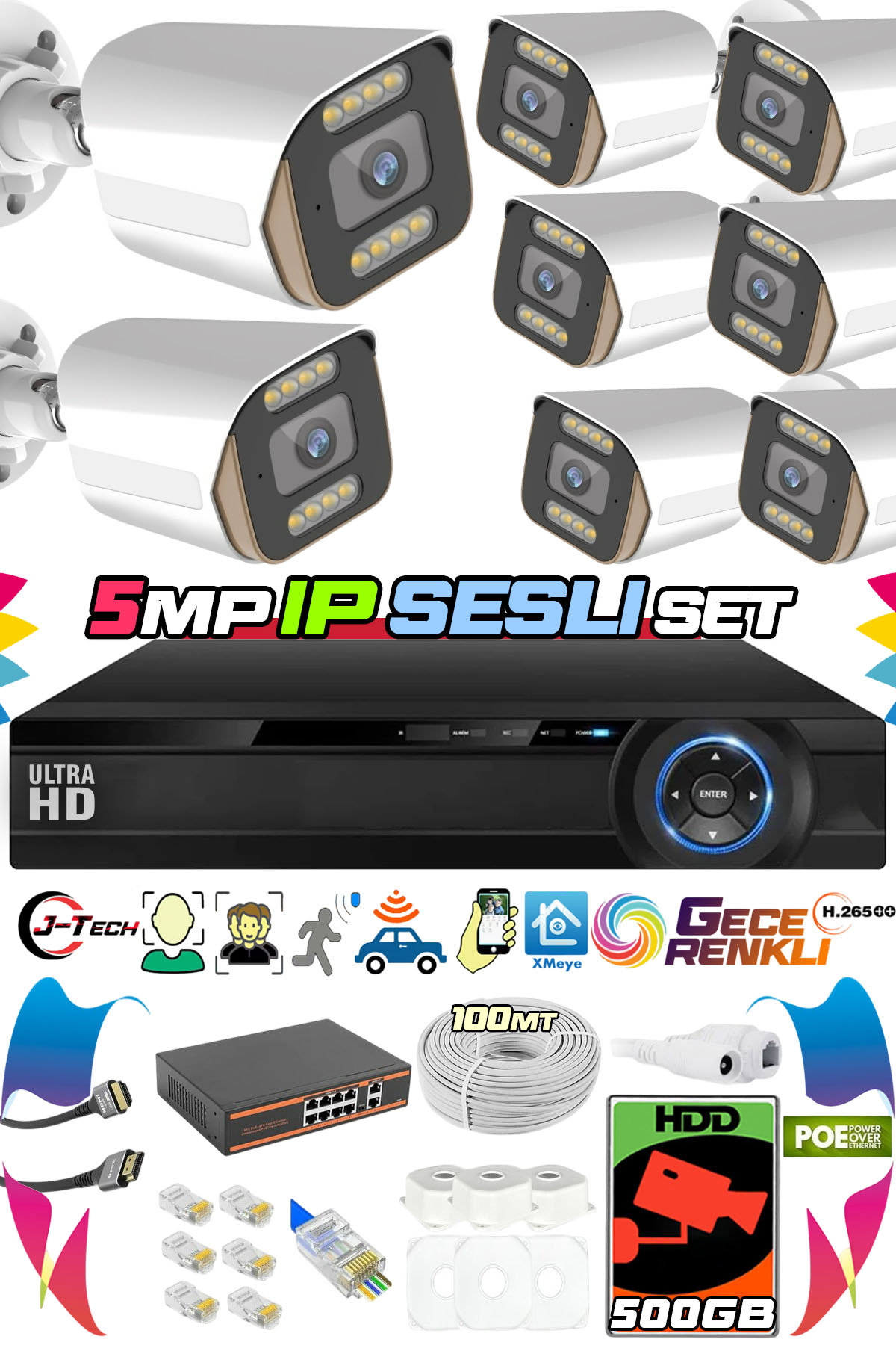8 Kameralı IP Set 500GB 9060 5MP Mikrofonlu HD Gece Renkli Güvenlik Kamerası Sistemi -Cepten izle