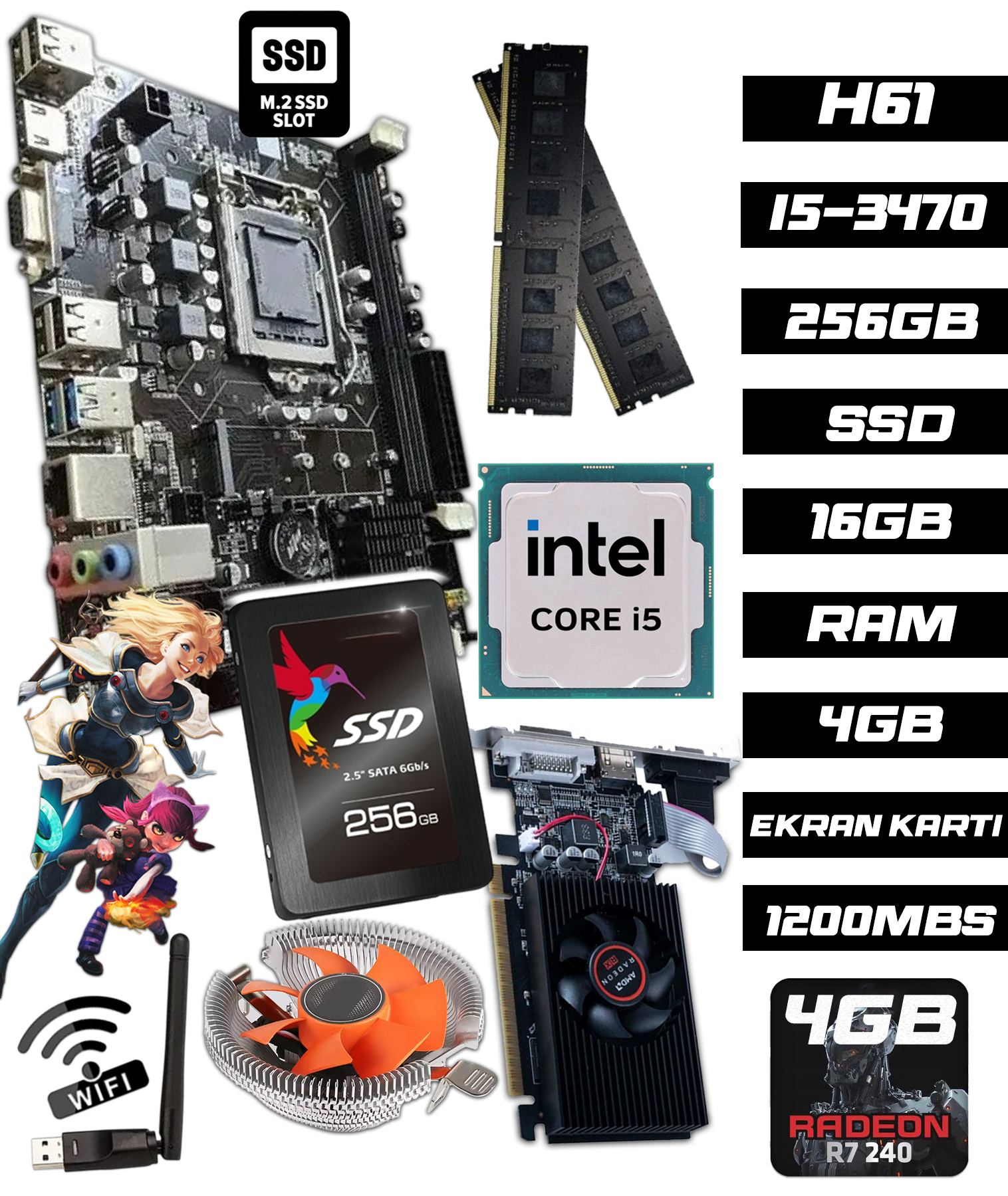 B12751 i5 3470 16GB RAM 256GB SSD R7240 4GB H61 1200Mbps WiFi CPU Fan Bundle Anakart Komple SET