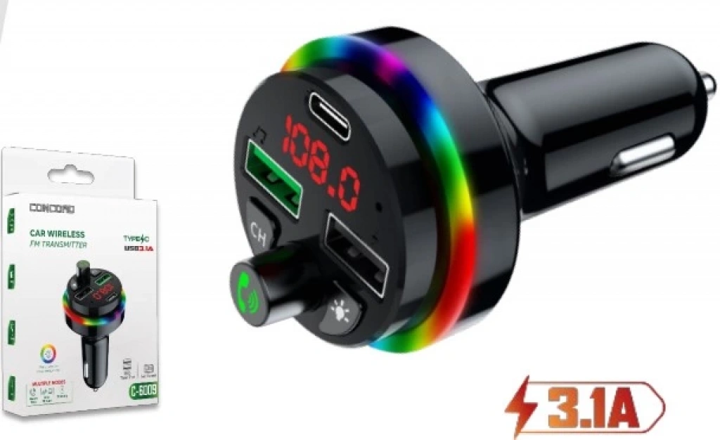 Concord C-6009 Bluetooth Görüşme Ve Müzik Dinleme Ekranlı RGB FM Transmitter PD 3.1A Çift Usb Şarj, araçlarınızda konforlu ve pratik bir müzik deneyimi sunar.