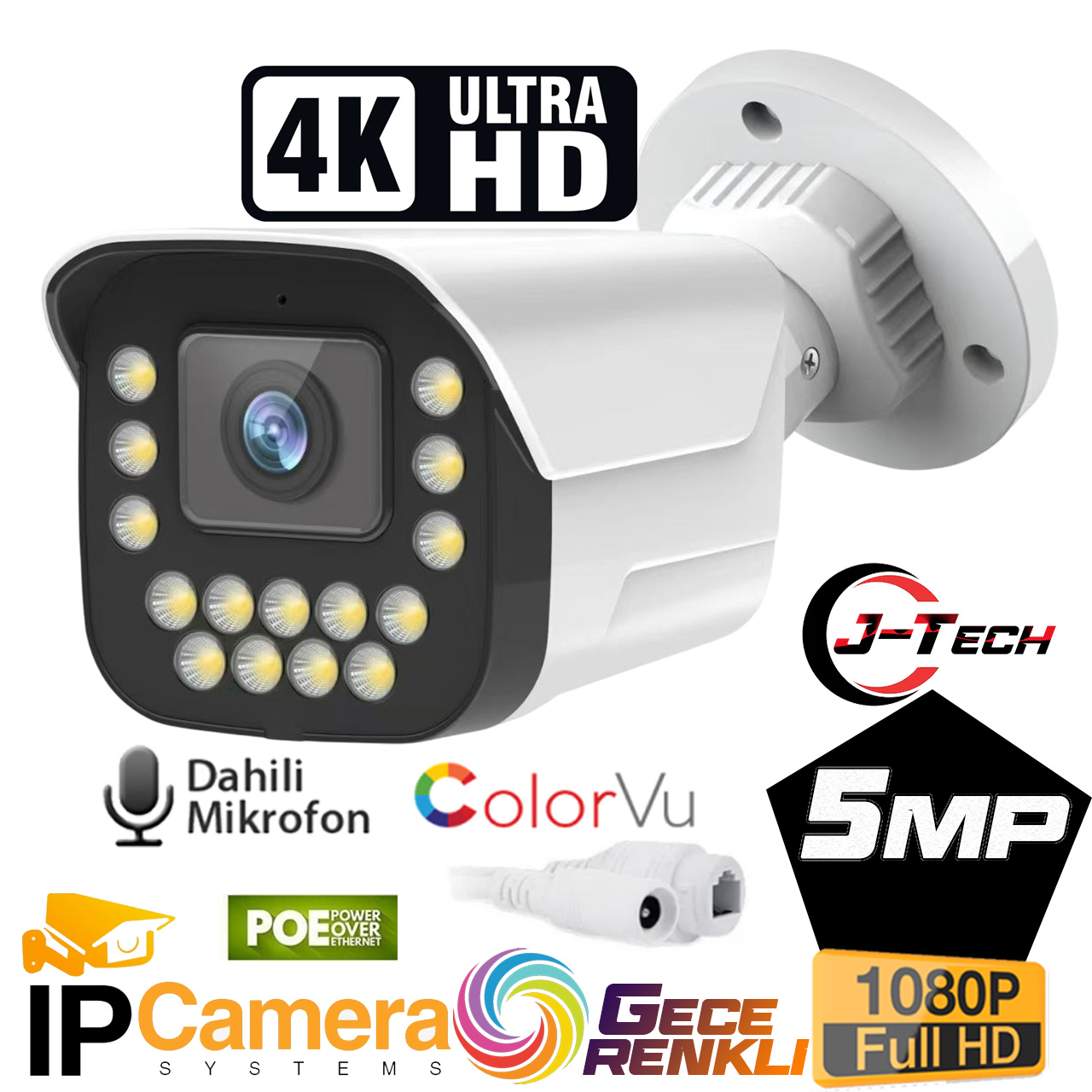 J-TECH 4K ULTRA HD 5MP SESLİ IP Bullet 15 LED PoE 3.6MM Network Kamera Gece-Gündüz Renkli Görüntü