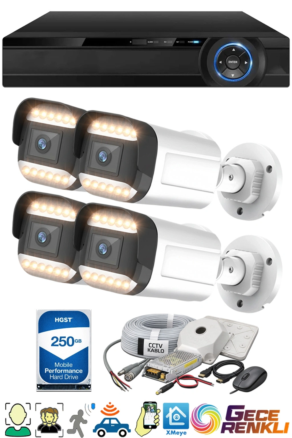 Bu akıllı kamera seti, yüz ve araç tanıma özellikleri ile geliştirilmiştir, böylece tanımsız kişiler ve araçlar hakkında anında uyarı alabilirsiniz. Ayrıca, gece görüşü özelliği sayesinde karanlık ortamlarda bile net ve renkli görüntüler elde edebilirsiniz.
