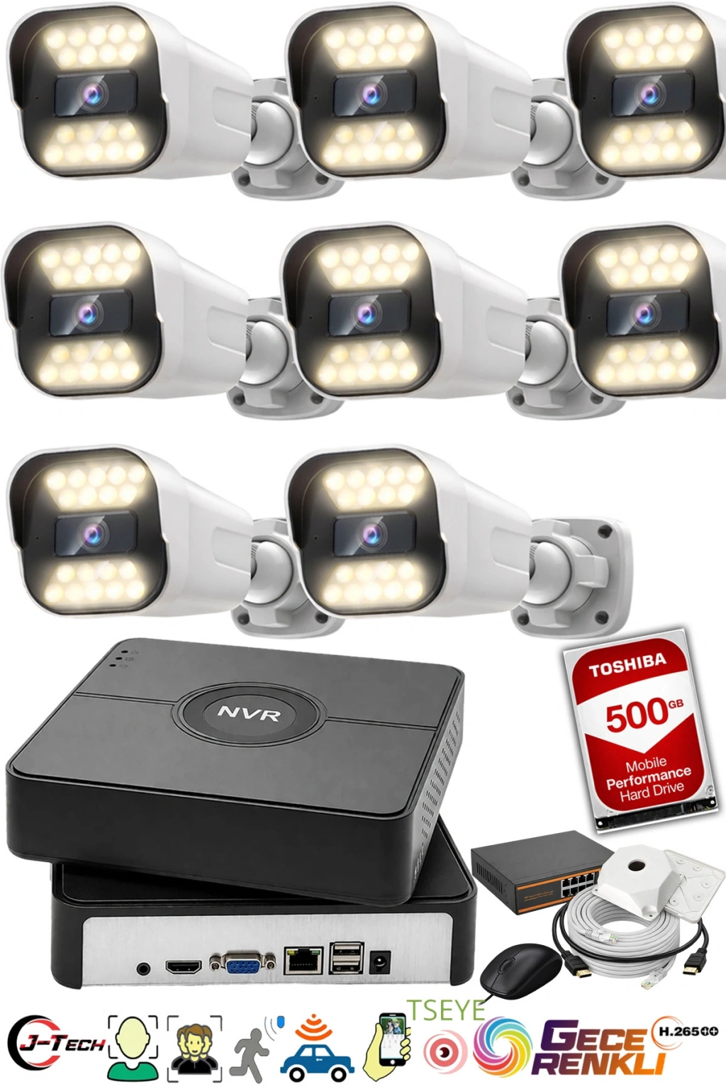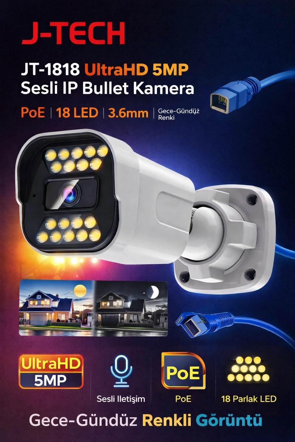 J-TECH 5MP Sesli 1818 iP Renkli Gece Görüşlü 8 Li 500GB Akıllı Güvenlik Kamera Seti, ev ve işyerlerinizin güvenliğini en üst düzeye çıkarmak için ideal bir seçenektir. İşte bu kamera setinin özellikleri: