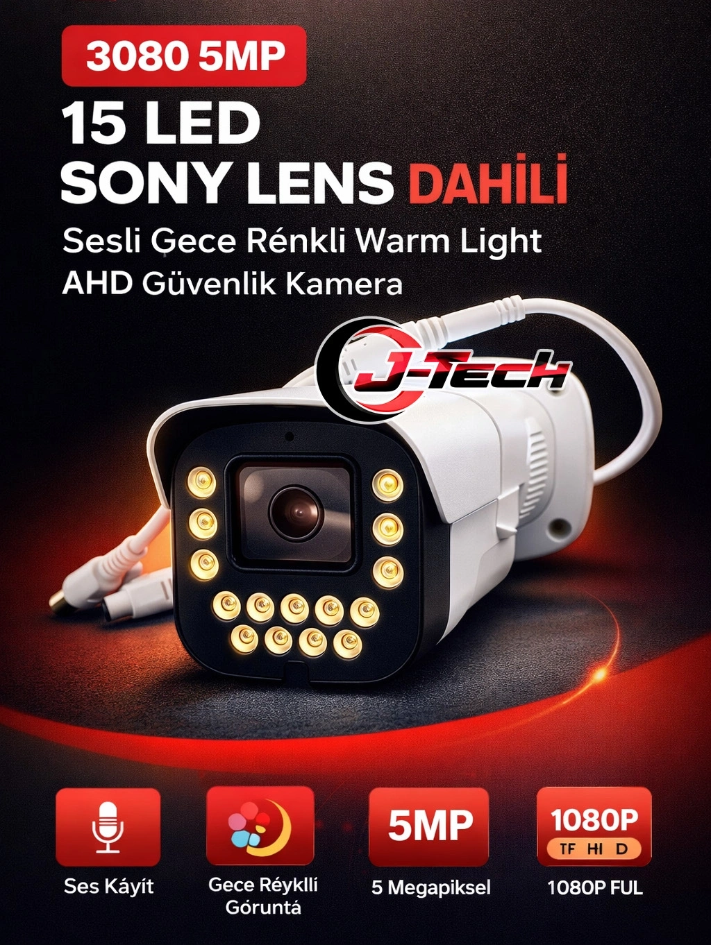 J-TECH 5MP Sesli 3080 Renkli Gece Görüşlü 4 Lü 500GB Akıllı Güvenlik Kamera Seti, yüksek çözünürlüklü görüntü ve yüz, araç tanıma özellikleriyle güvenliği bir üst seviyeye taşıyor.