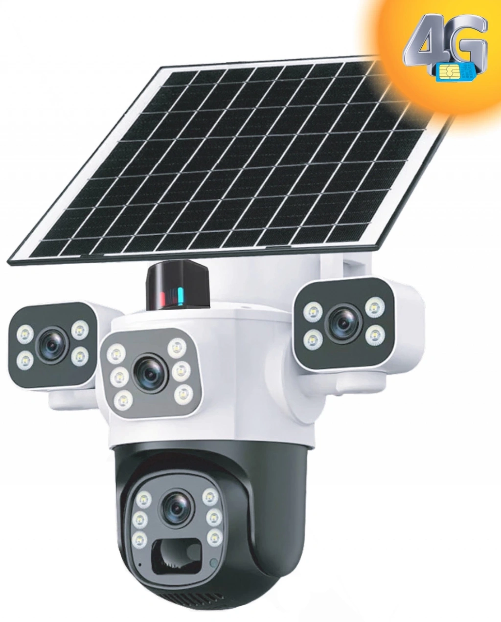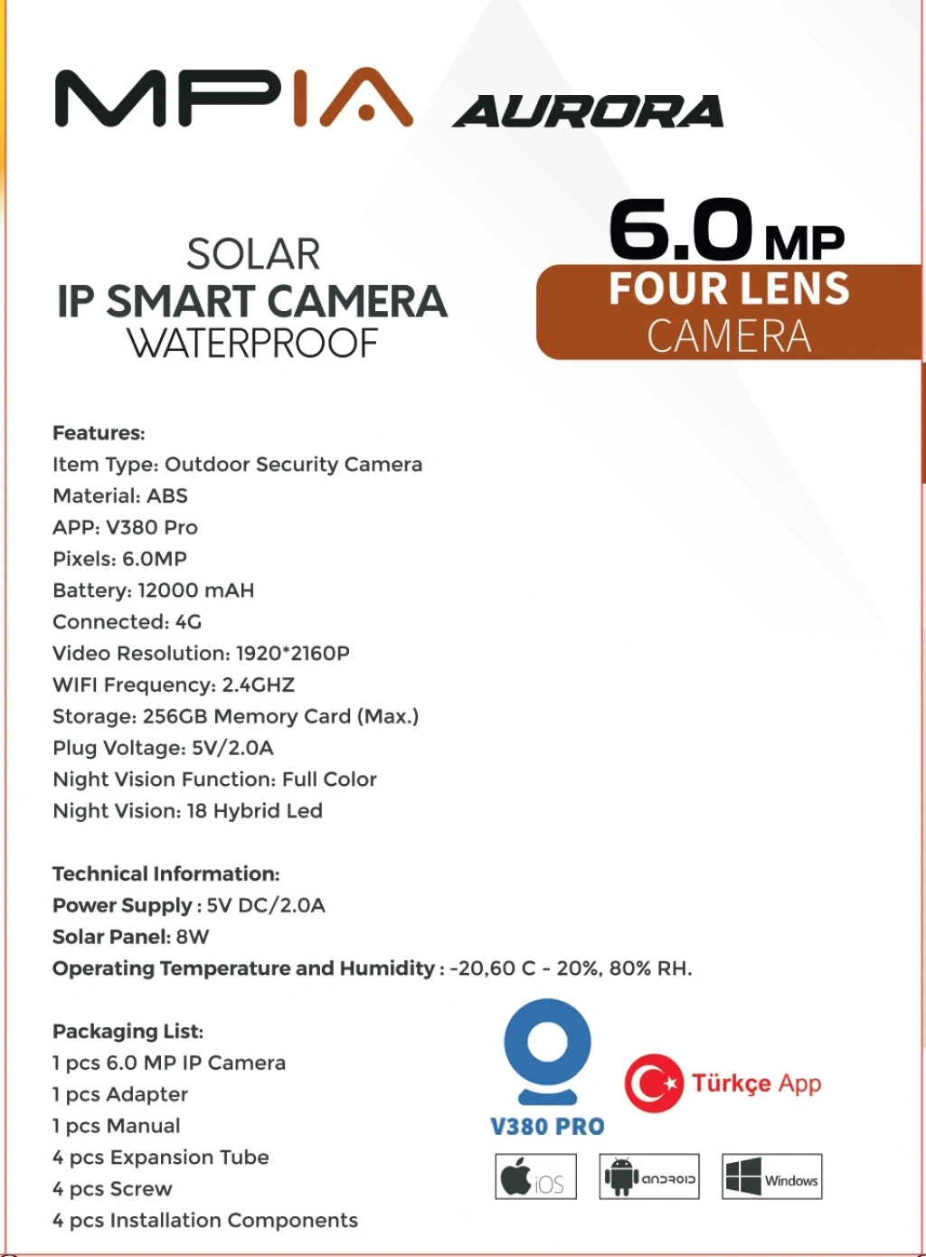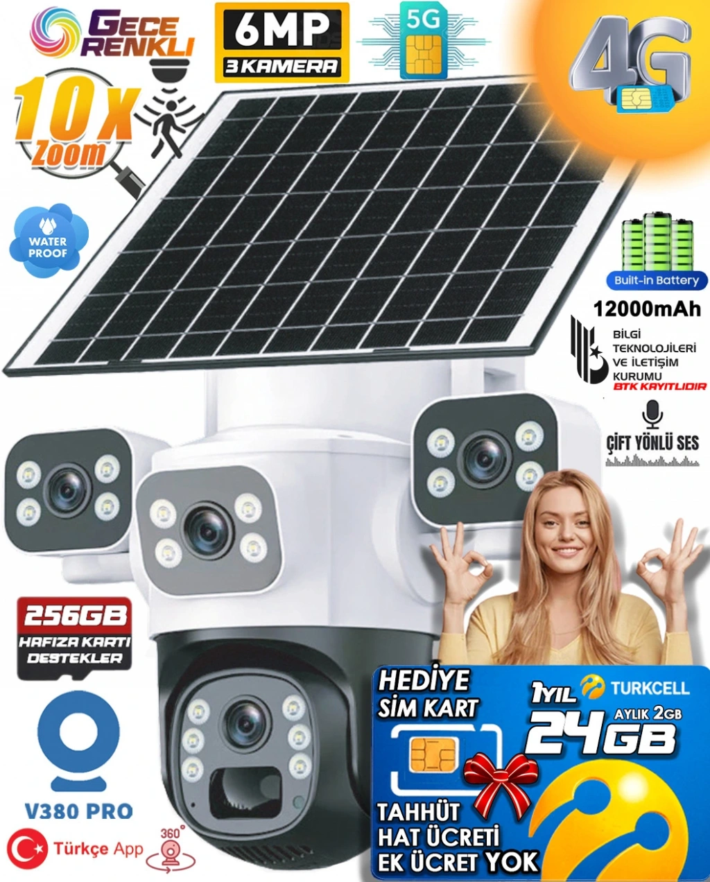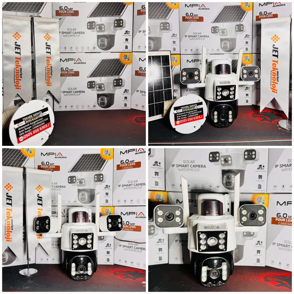 MPIA Aurora 3 Kameralı 4G 6MP 4K Sim Kart Hediye Güneş Panel 4 Lens Solar 12000mAH Alarmlı Mikrofon 360 PTZ Türkçe Uygulama Güvenlik Kamera