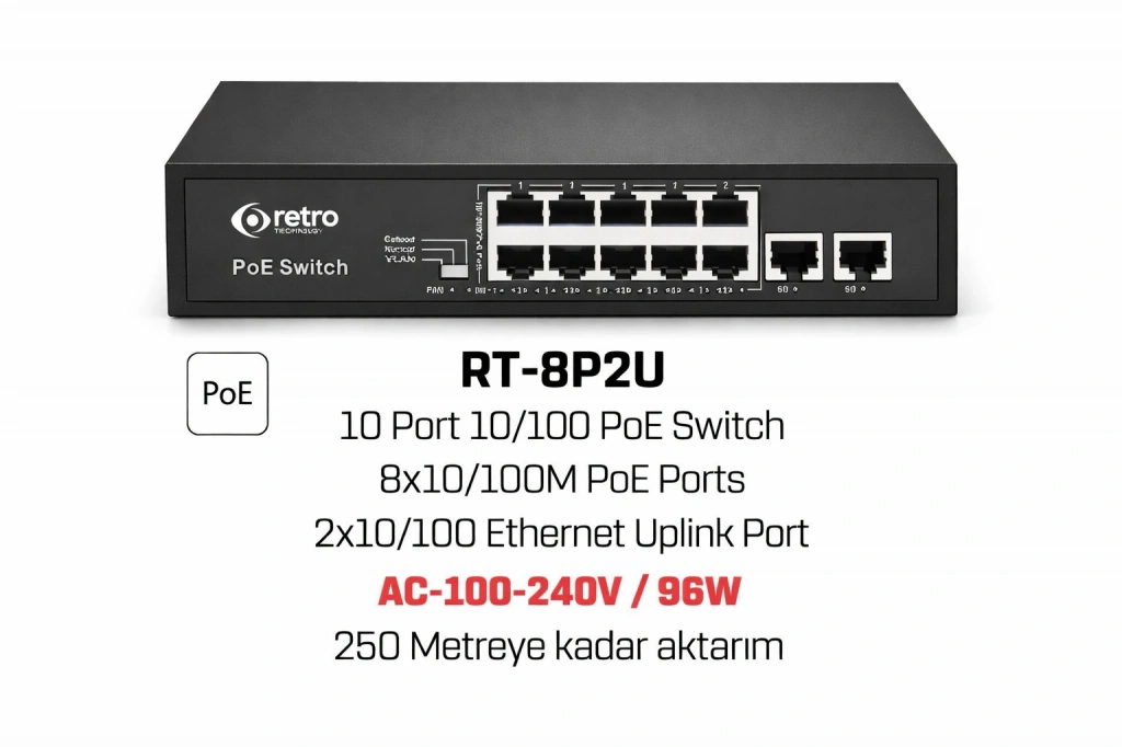 Retro RT-8P2U 8 Port 10/100 Mbps PoE Switch ile ağınızı güçlendirin. (100 karakter)