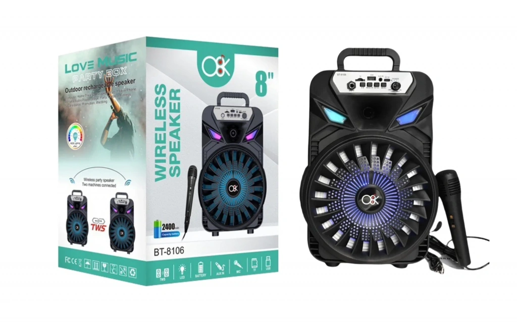 Platoon PL-8106, mikrofonlu, yüksek sesli, RGB ışıklı hoparlör. Taşınabilir ve çok yönlü bir ses deneyimi sunar.