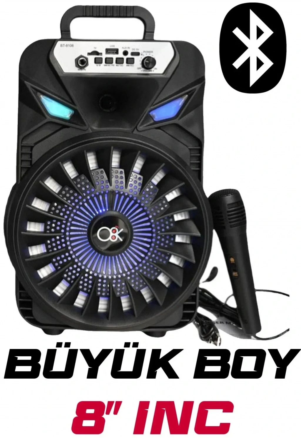Platoon PL-8106 BT USB SD AUX 8 İNÇ Mikrofonlu Anfi Yüksek SES Taşınabilir RGB Işıklı Hoparlör
