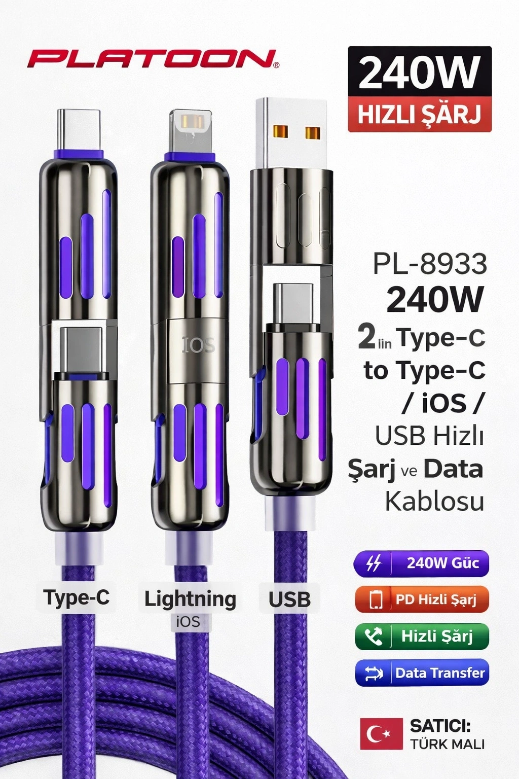 Platoon PL-8933 240W 2in1 Type-C to Type-C / iOS / USB Hızlı Şarj ve Data Kablosu ile teknoloji deneyiminizi daha keyifli hale getirin!