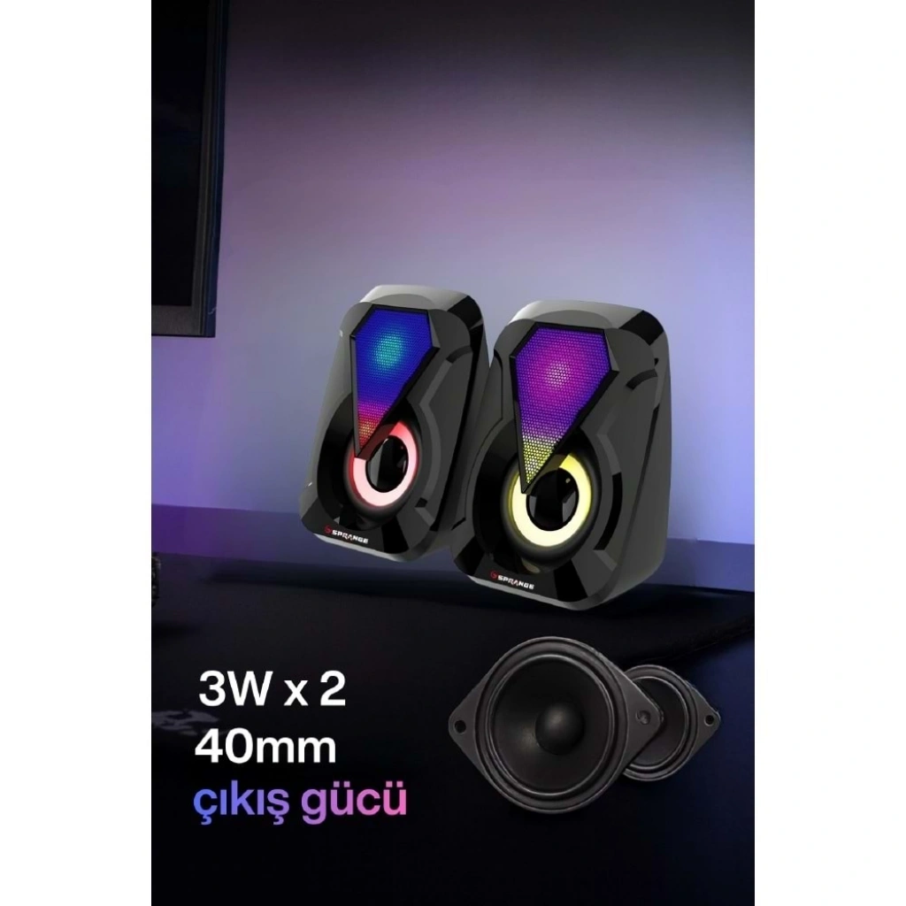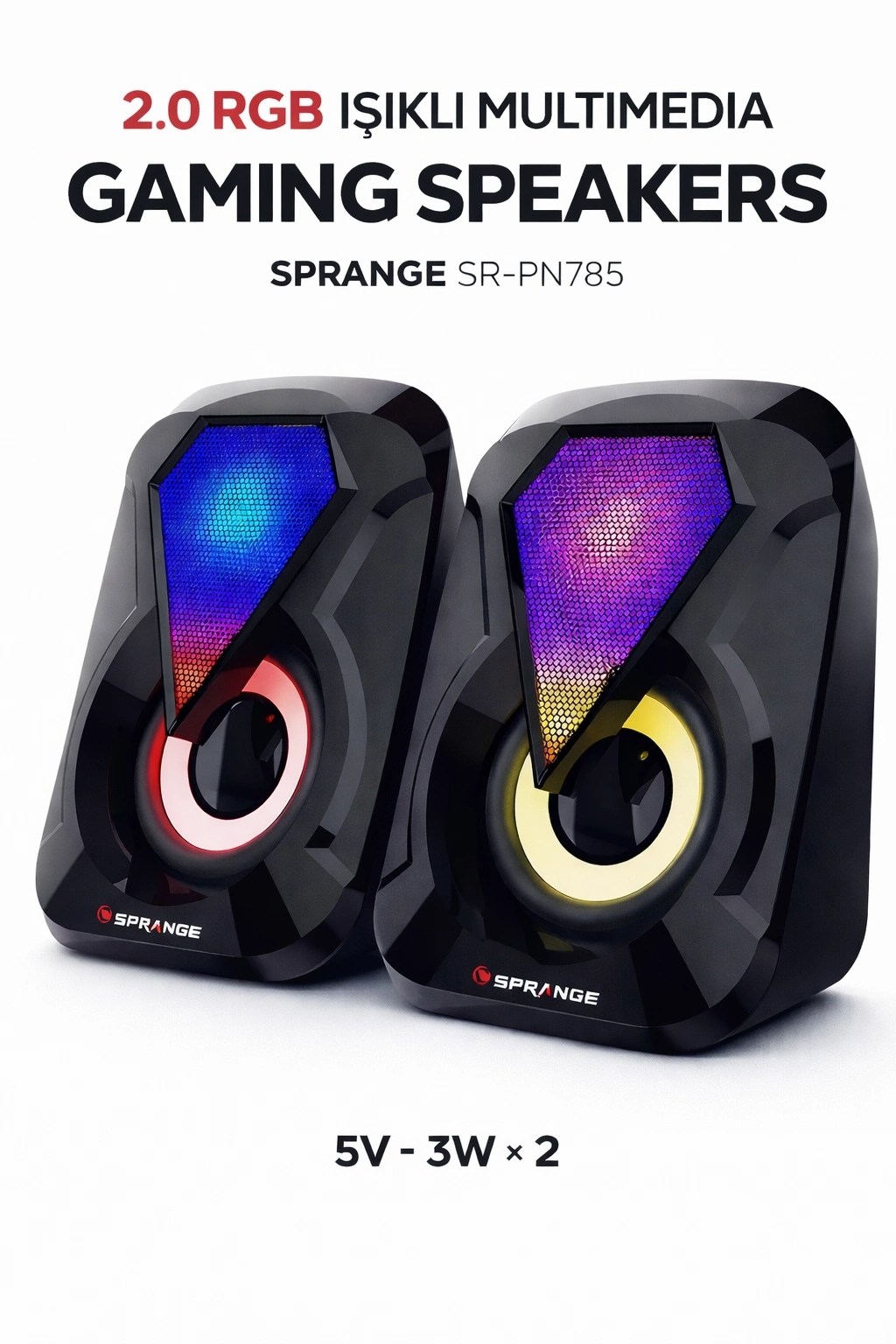 Sprange SR-PN785 2.0 RGB Işıklı Multimedia 5V 3W*2 Gaming Oyuncu Speaker -Siyah, oyun deneyiminizi bir üst seviyeye taşıyan bir ses sistemi çözümüdür. İşte ürünün özellikleri: